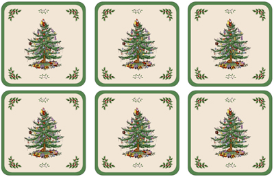 | Maker: Spode Pattern:Christmas Tree colour Coasters set of Six The mats are sealed with a high quality lacquer finish, that is both stain and heat resistant to 100 degrees centigrade and are finished with a hard wearing cork back. This item has been discontinued by Spode and is no longer available. Dimensions: 10 cm x 10 cm / 4 ins x 4 ins