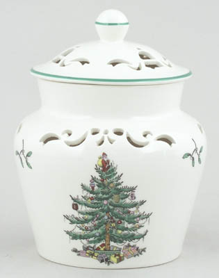 | Maker: Spode Pattern:Christmas Tree colour Pot Pourri Jar Brand new and first quality china. This is such a pretty piece - pot pourri pot and cover both with decorative piercing detail. This item has been discontinued by Spode and is no longer available. Dimensions: Diameter at neck 9 cm, overall height 15 cm / Diameter at neck 3.5 ins, overall height 6 ins