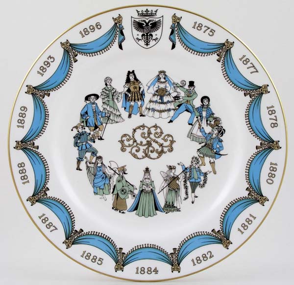 Backstamp: The D'Oyly Carte Plate. Designed with the co-operation of the D'Oyly Carte Opera Company and the approval of Miss Bridget D'Oyly Carte, this plate was inaugurated in 1975, the centenary year, to commemorate the collaboration of William S Gilbert and Arthur Sullivan with Richard D'Oyly Carte. Also listed 13 operas performed between 1875 and 1896. Spode England Bone China.